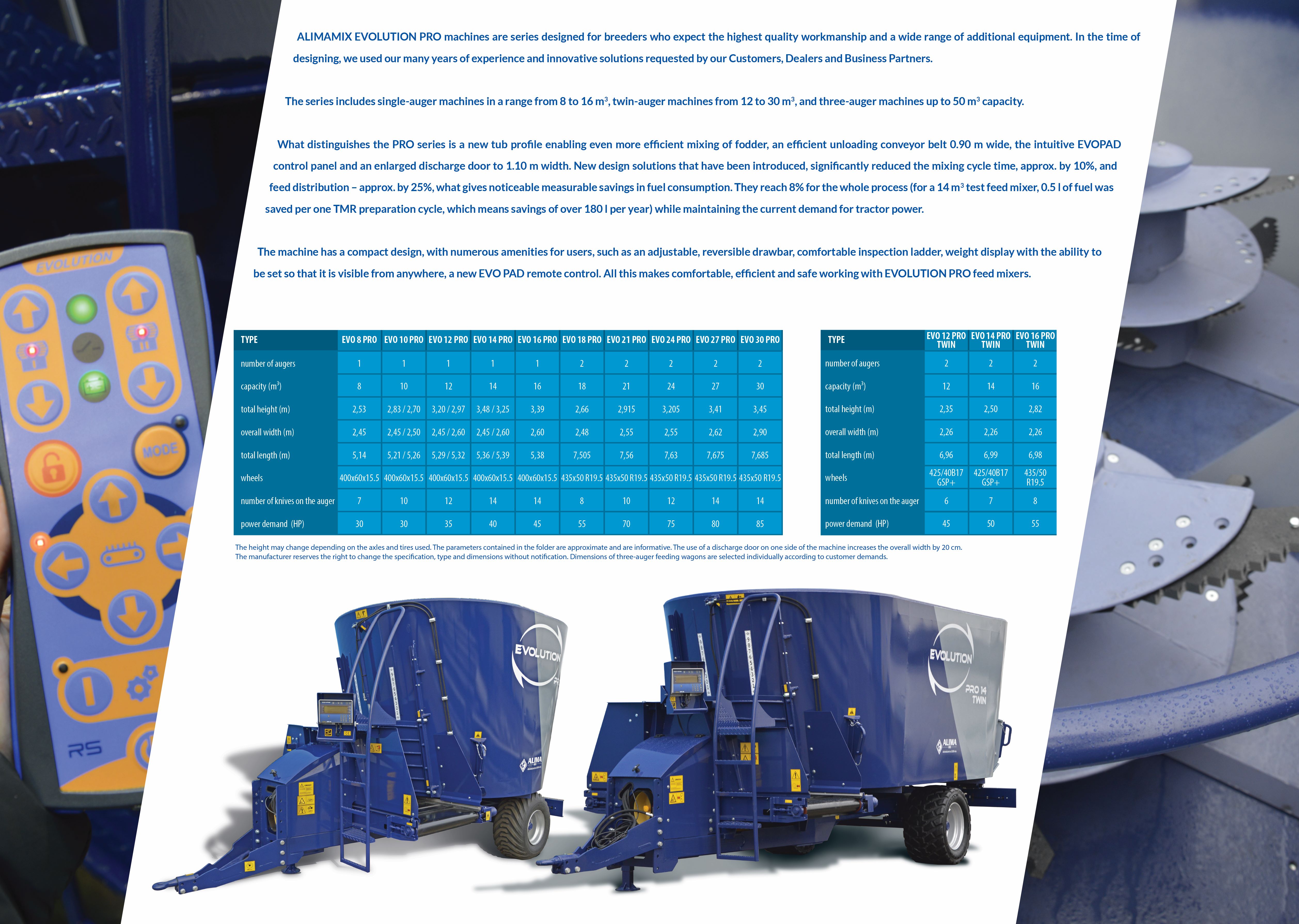 - ALIMAMIX EVOLUTION diet feeders ranging from 4 m³ to 50 m³, with a cross-over auger system;
